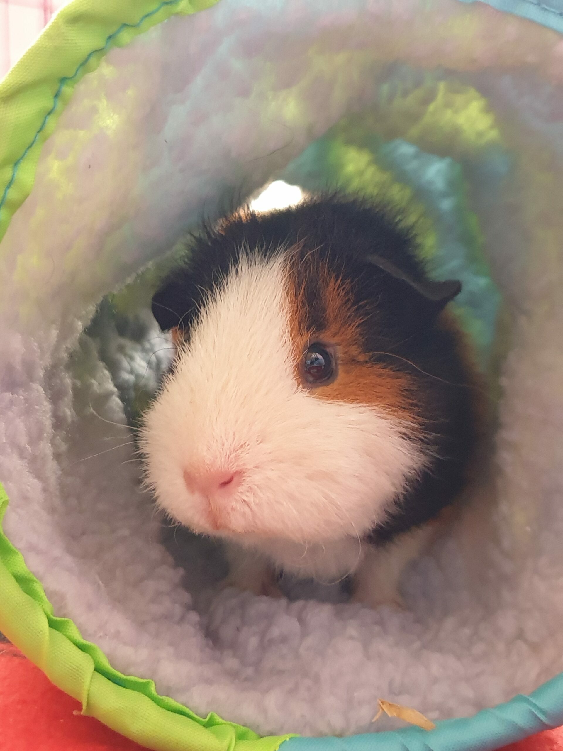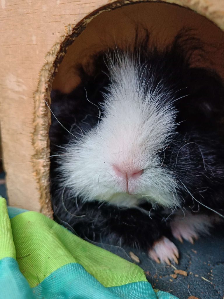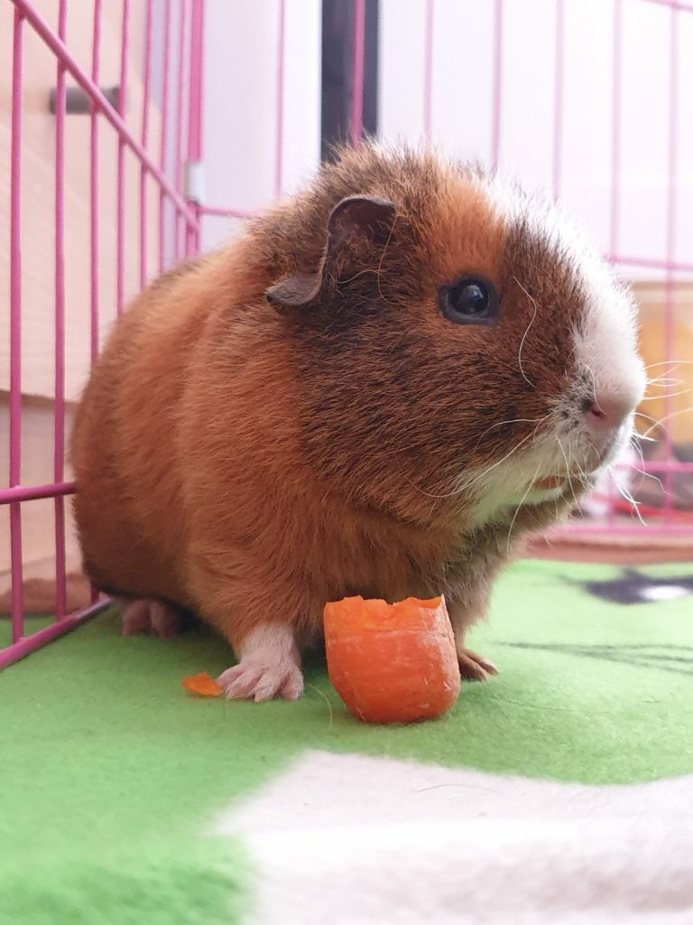 Molly is a cute little guineapig! She is not the bravest. She let’s Mientje go on exploring or figure out the brain games and then runs in to eat the treats. Molly loves pets and cuddles… but hates being picked up. When you pet her head or under her chin she will close her eyes in enjoyement. She is also the first one to shout for a friend when she is alone.She also has a thicker fur and she loves soft things to sleep in! :feet: